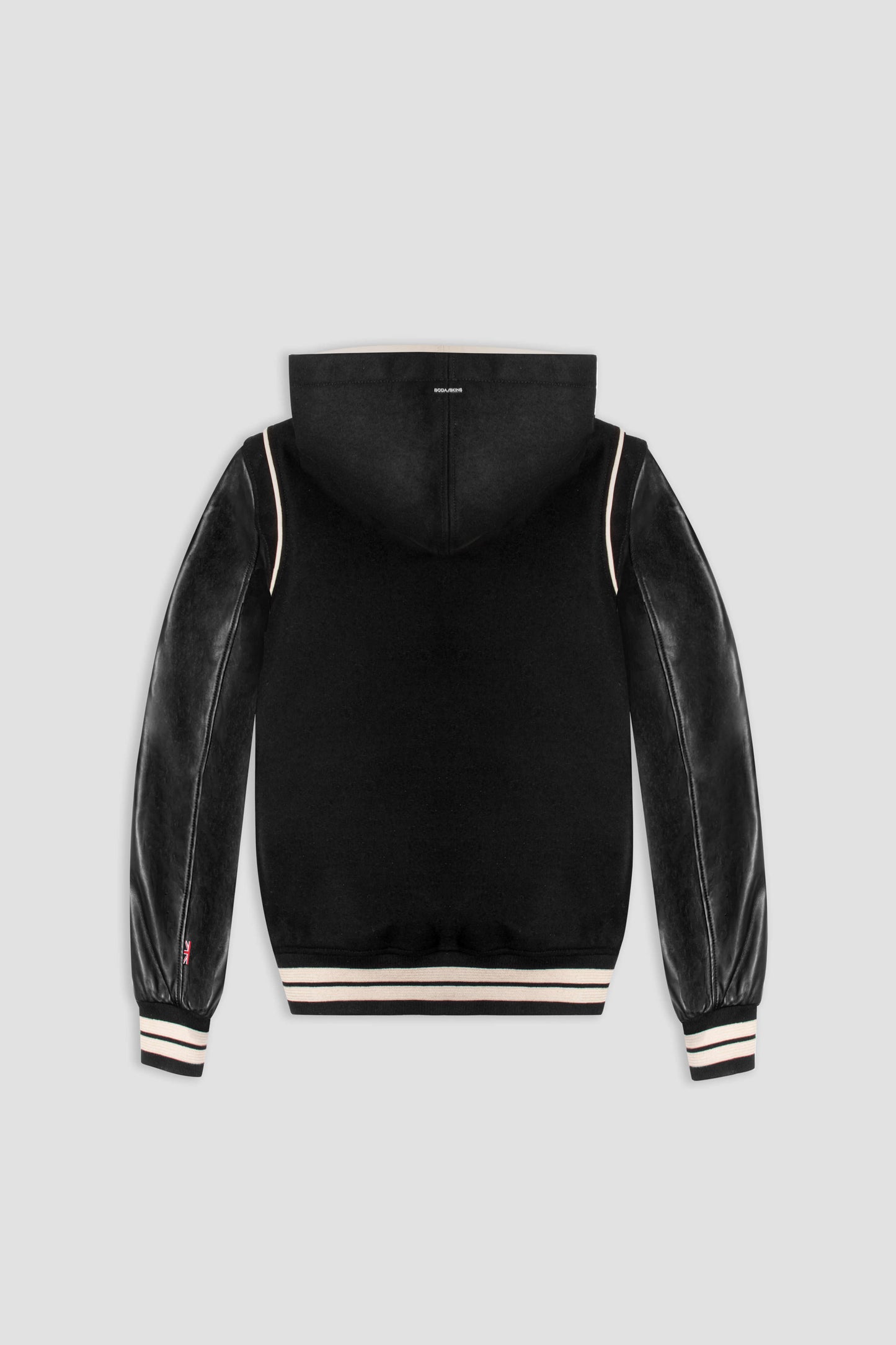 The Hooded Varsity is a take on the classic BODA Varsity with an enhanced functionality. Based on the designs from the previous Varsity, this hooded style features an all-black appearance, with contrast detailing throughout. The two detachable hoods offer 3 different ways to style our outfit, for further versatility one is a black melton wool and the other an off-white leather.