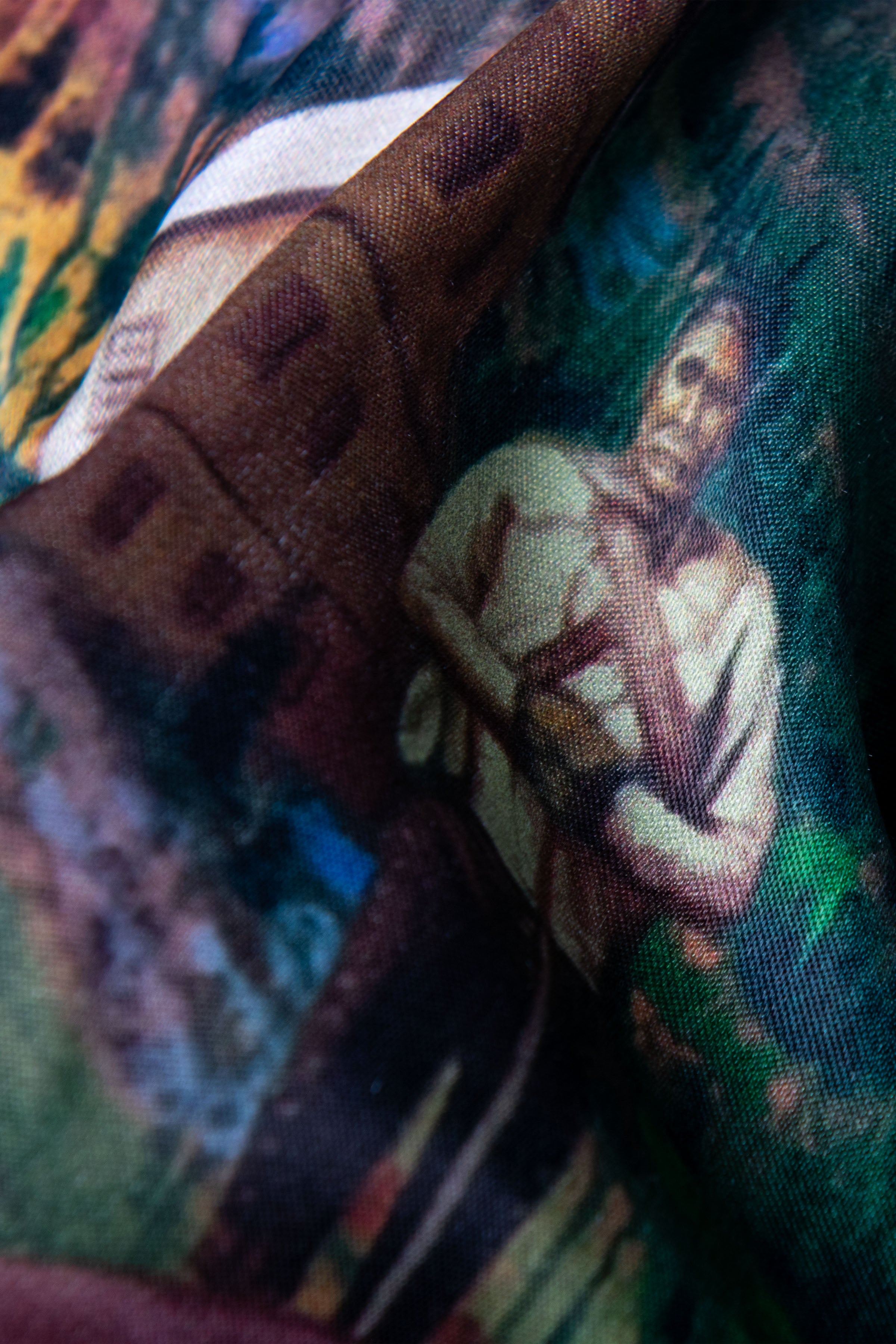 The piece depicts a fictional narrative that de-parts from the determination of the past. A vista of the Maroon Bells establishes a theatre for figures from conflicting time periods. A firefighter stands adjacent to a fur trader, a snowboarder rests amongst the trees above a Ute man standing up-right adjacent to a European frontier structure. Central to the composition is a cougar talisman holding a singular Aspen tree gesturing towards the viewer.