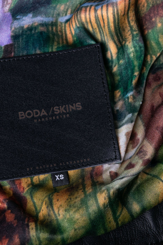 Our best-selling men’s leather, the Kay Michaels, refined with elevated branded platinum hardware and limited edition lining. This exclusive edition features an asymmetrical zip, quilt detailing, slanted pockets and our vibrant "Settler Surrealism" lining; a painting created for BODA SKINS inspired by Aspen, Colorado and its rich history.