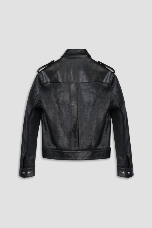 PLEASE NOTE - due to the inherent nature of the crackle leather, a transfer of black dye may occur with this jacket.
