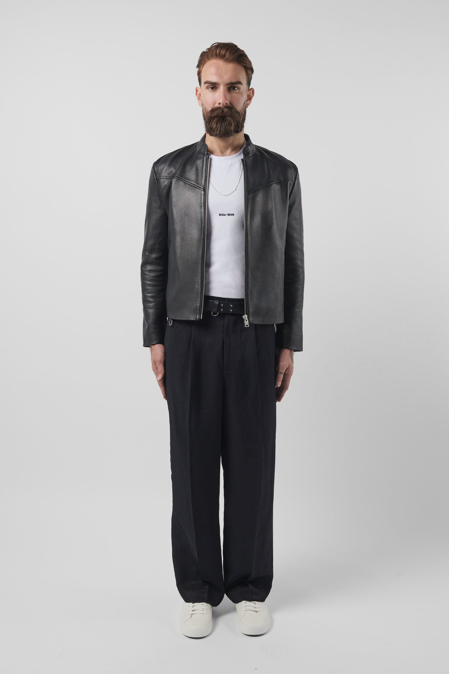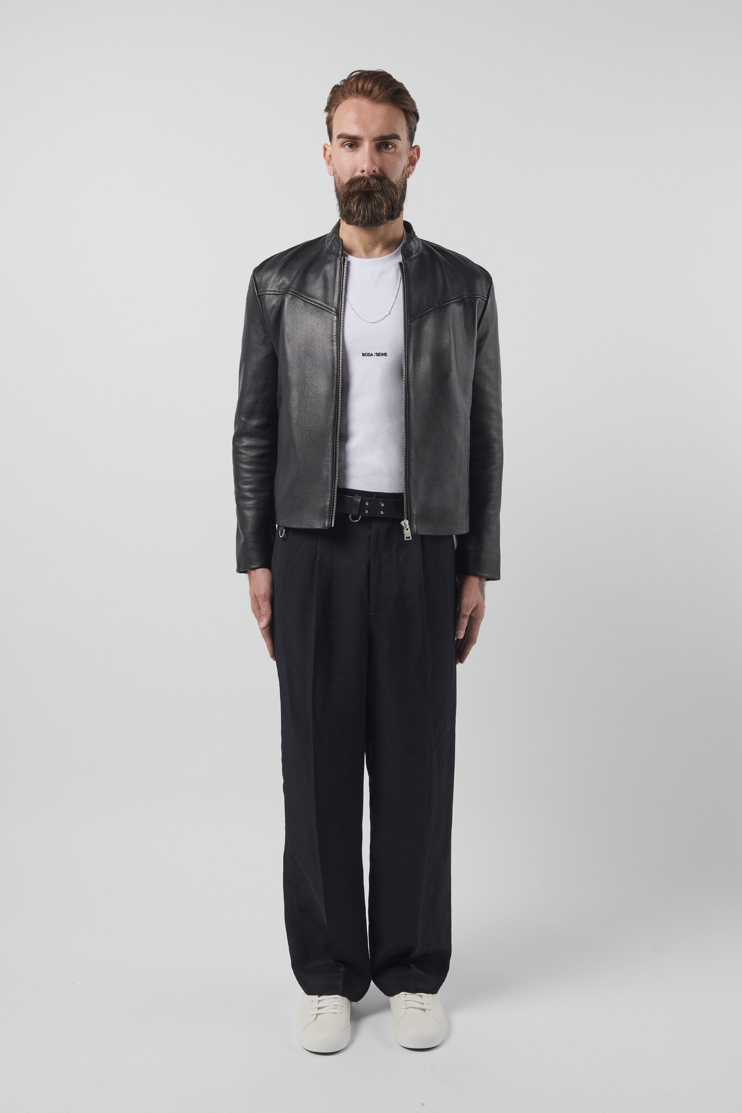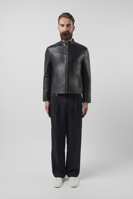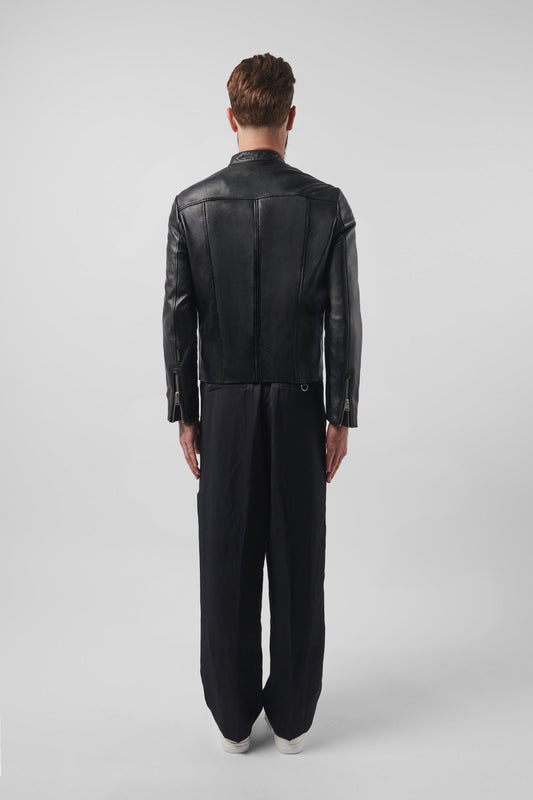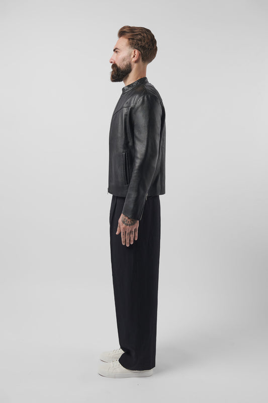 The Racer is a re-imagined take on our favoured Hendrix jacket. Inspired by iconic racer silhouettes, its sleek appearance is complimented by a classic band collar with the addition of a D-ring and O-ring for accessory attachments. Our minimalist design is crafted from premium cow grain leather and features a comfortable viscose twill lining; enhancing its versatility and timeless structure.