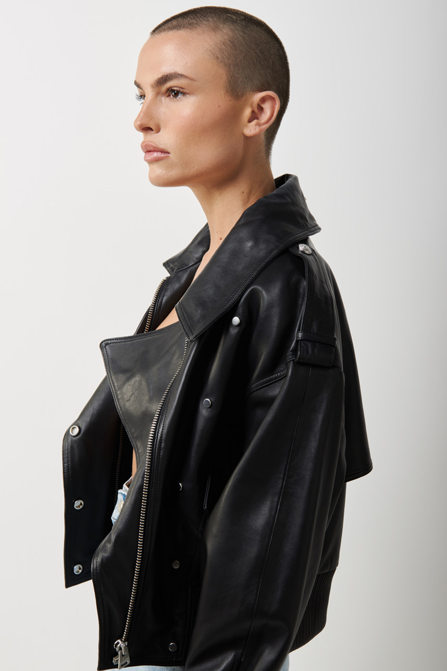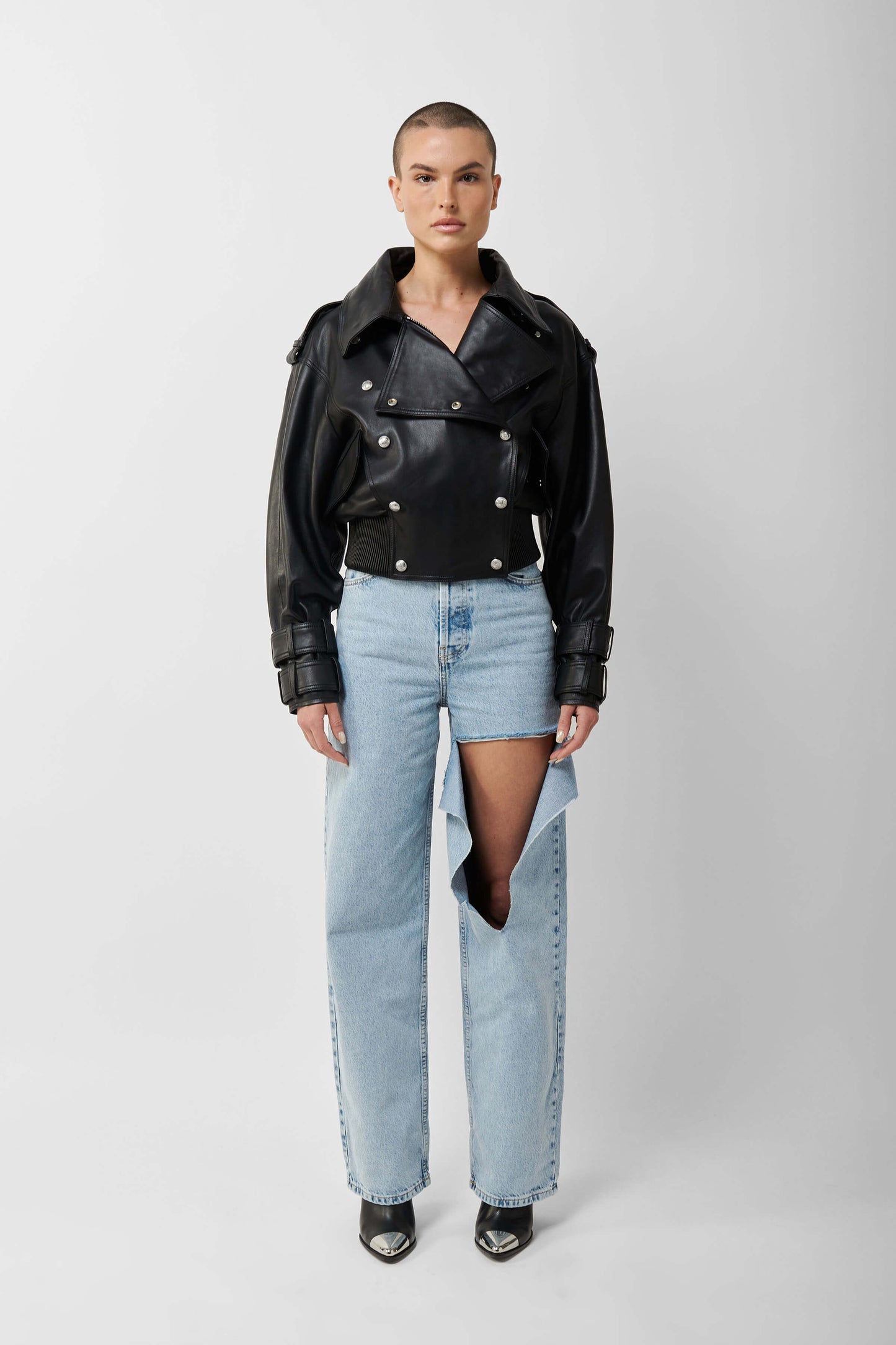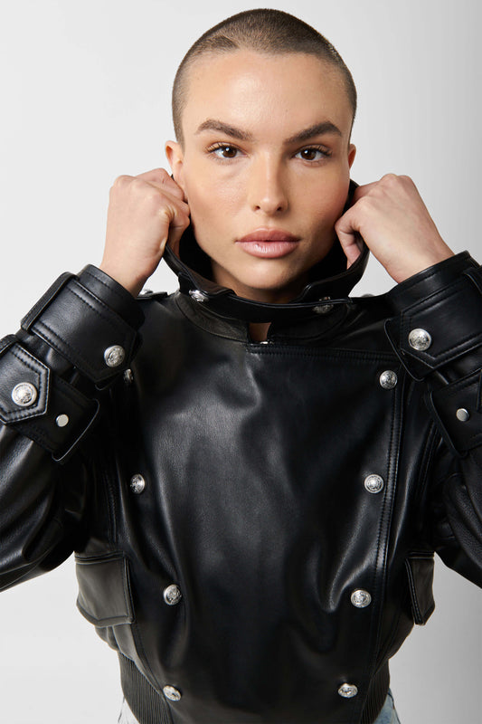 Introducing the Empress, a modern instalment to our womenswear line crafted from 100% Lambs Leather. Evolved from our archive Napoleon silhouette, Empress features iconic characteristics of its predecessor but is refined with contemporary detailing, from a cropped relaxed fit to premium domed insignia press studs. The intricately detailed hardware across the epaulettes, adjustable cuffs and main front, features an eagle; symbolic of love, honour and bravery, complimentary to the powerful spirit of the Empress.