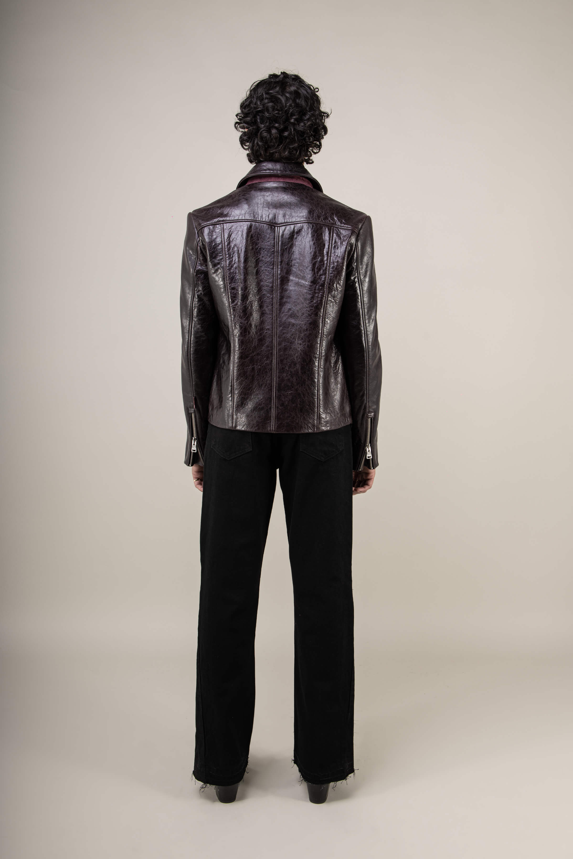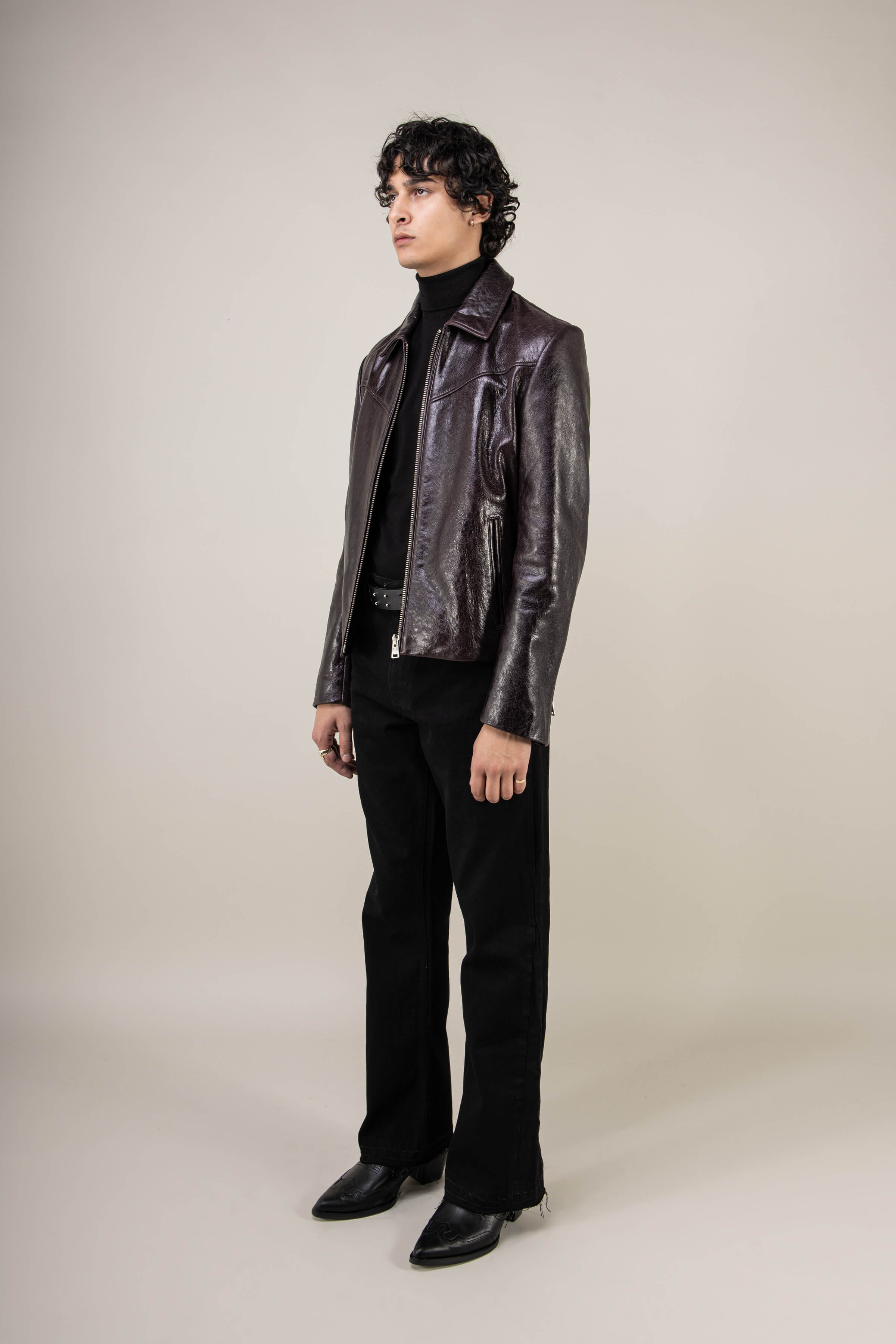 The Hendrix is the definition of cool simplicity. This pristine silhouette has been crafted from premium British lamb's leather, is fitted with a smart, symmetrical classic collar, and features suede detailing at the collar stand with sail stitch. The Hendrix features our exclusive paisley print lining and makes layering effortless.