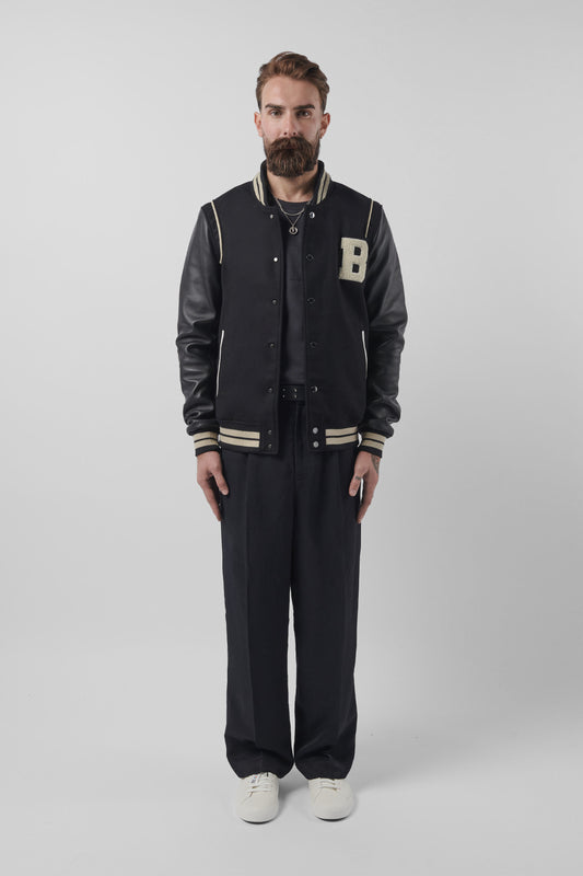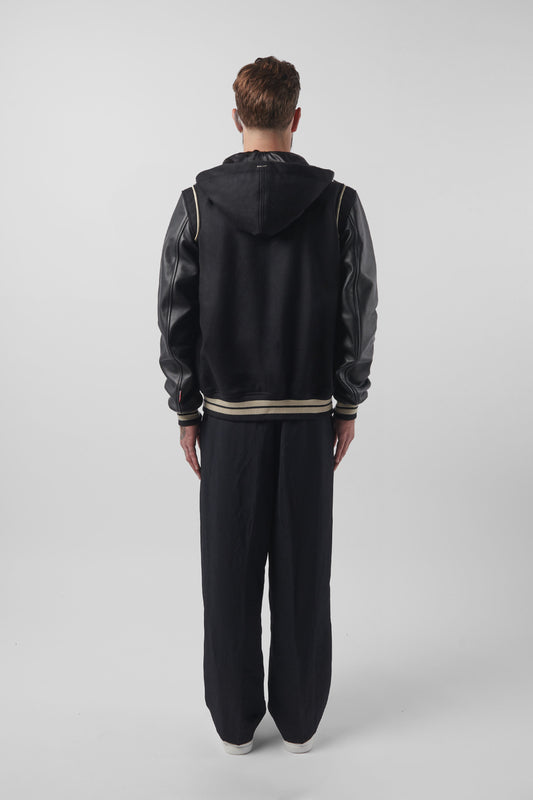 The Hooded Varsity is a take on the classic BODA Varsity with an enhanced functionality. Based on the designs from the previous Varsity, this hooded style features an all-black appearance, with contrast detailing throughout. The two detachable hoods offer 3 different ways to style our outfit, for further versatility one is a black melton wool and the other an off-white leather.