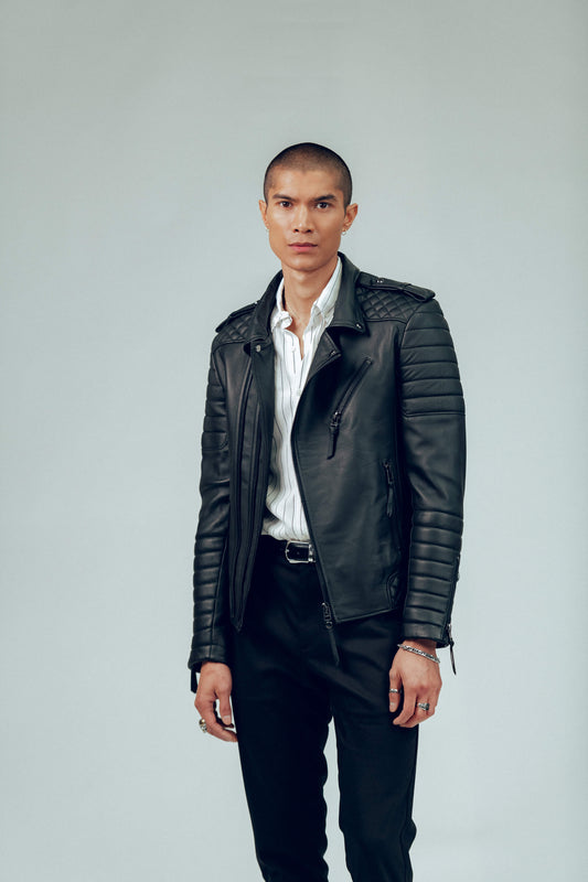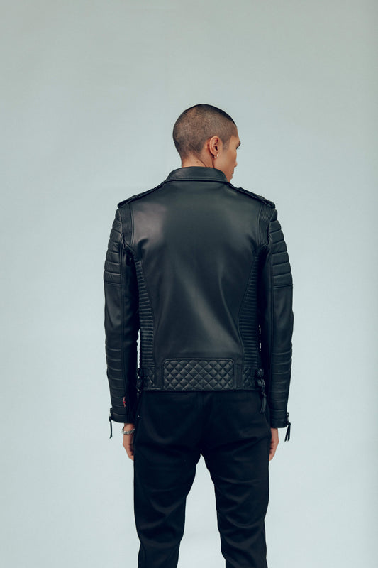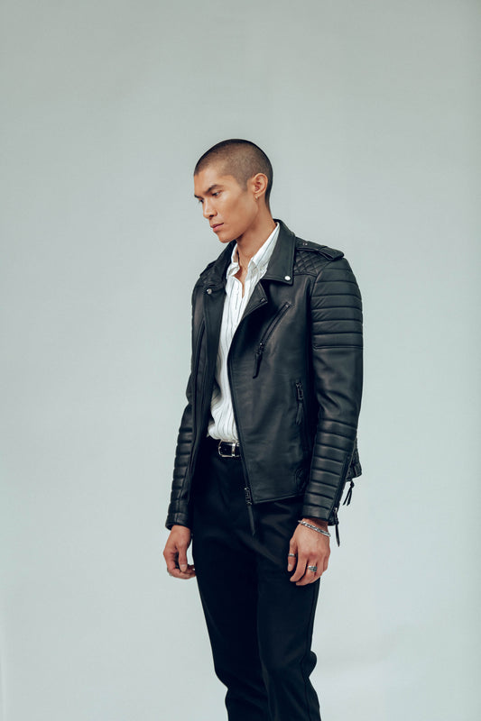 The classic Kay Michaels is our best-selling leather, featuring gun-metal hardware, quilted detailing on the shoulders, and ribbed detailing on the arms and side panels. The zip cuffs allow room for extra layering and internal pockets for phones and card-holders.