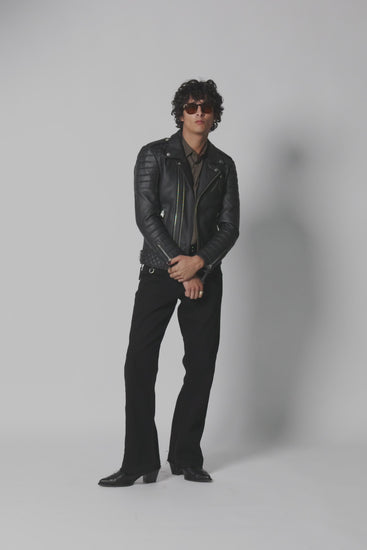 The jacket boasts enhanced detailing across the shoulders, paired with distinctive ribbed leather panels on the arms and sides, which add to the biker look. These design elements not only contribute to the jacket’s bold, masculine look but also enhance flexibility and movement, making it as comfortable as it is stylish.