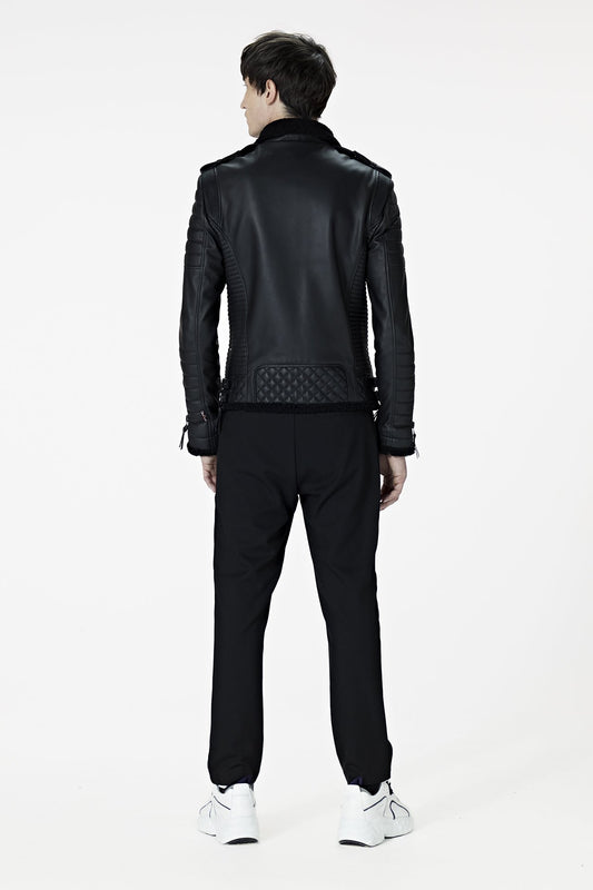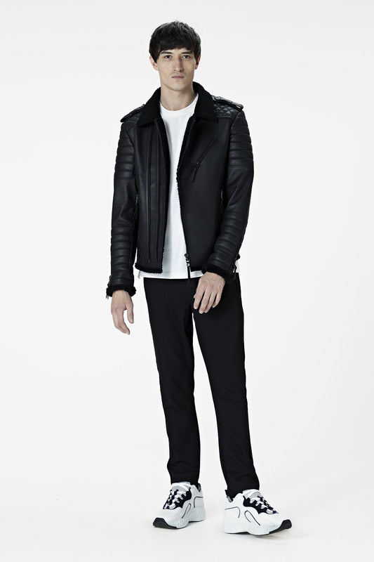 Our best-selling signature black leather jacket, the kay michaels. Featuring a sheep wool collar, quilted detailing on the shoulder, ribbed detailing on the arms and side panels with buckle details attached. The zips on the cuff are functional to give extra room for layering. The interior is lined with premium cotton stretch lining and features 2 inside pockets for a phone or card holder. Finished with signature hardware.