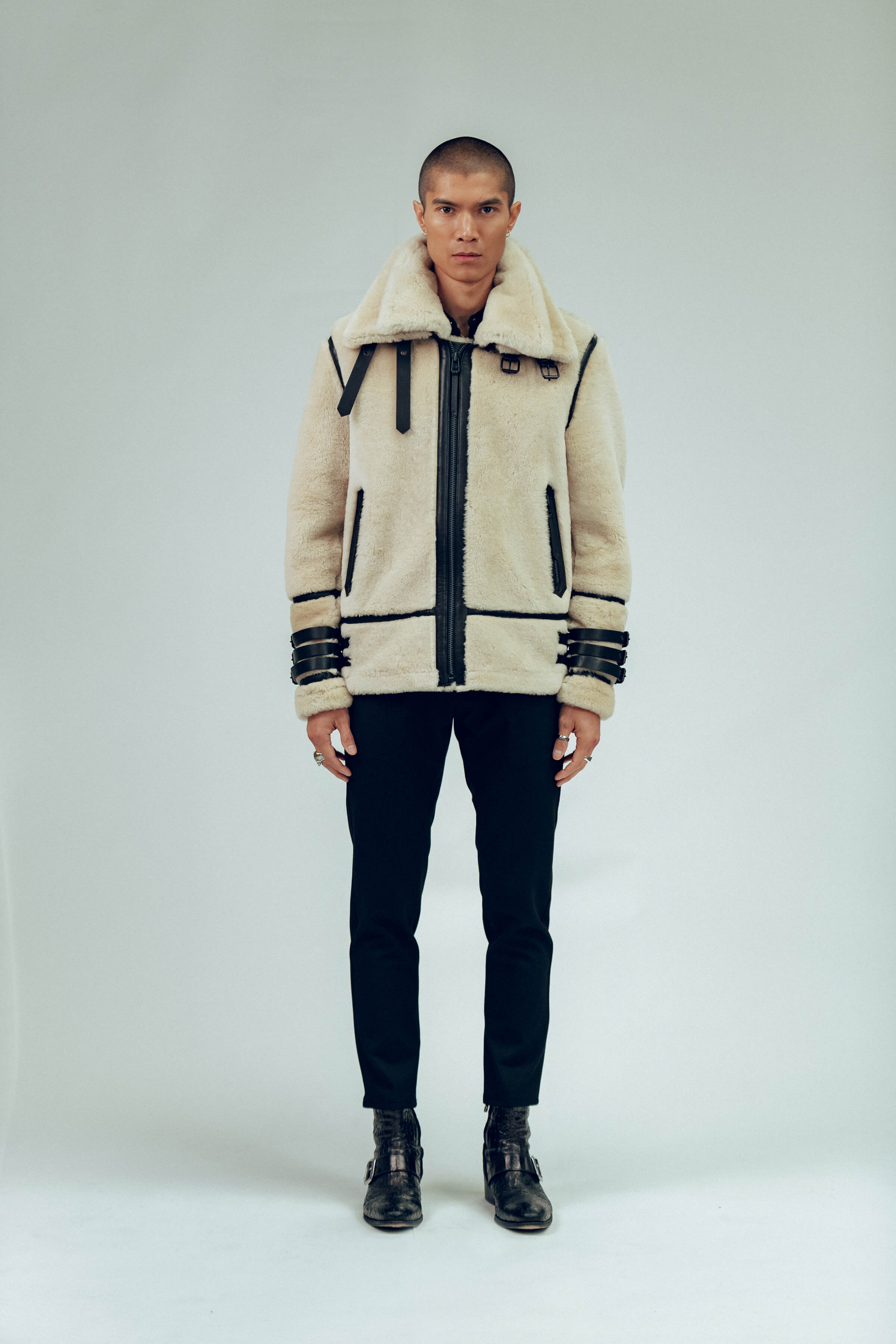 Handcrafted from exclusive velvety-smooth shearling, the POLAR 3.0 offers unparalleled warmth while maintaining a sleek and structured profile. The ironed wool shearling body is accented with nappa leather contrast details, giving the jacket its signature texture and edge. Military-inspired buckles at the wrists and waist add adjustability and strength, while the removable double collar allows versatility, offering extra insulation on the harshest days or a more streamlined profile for everyday wear.