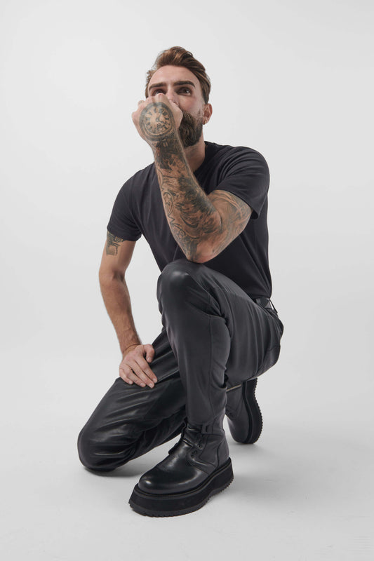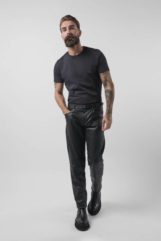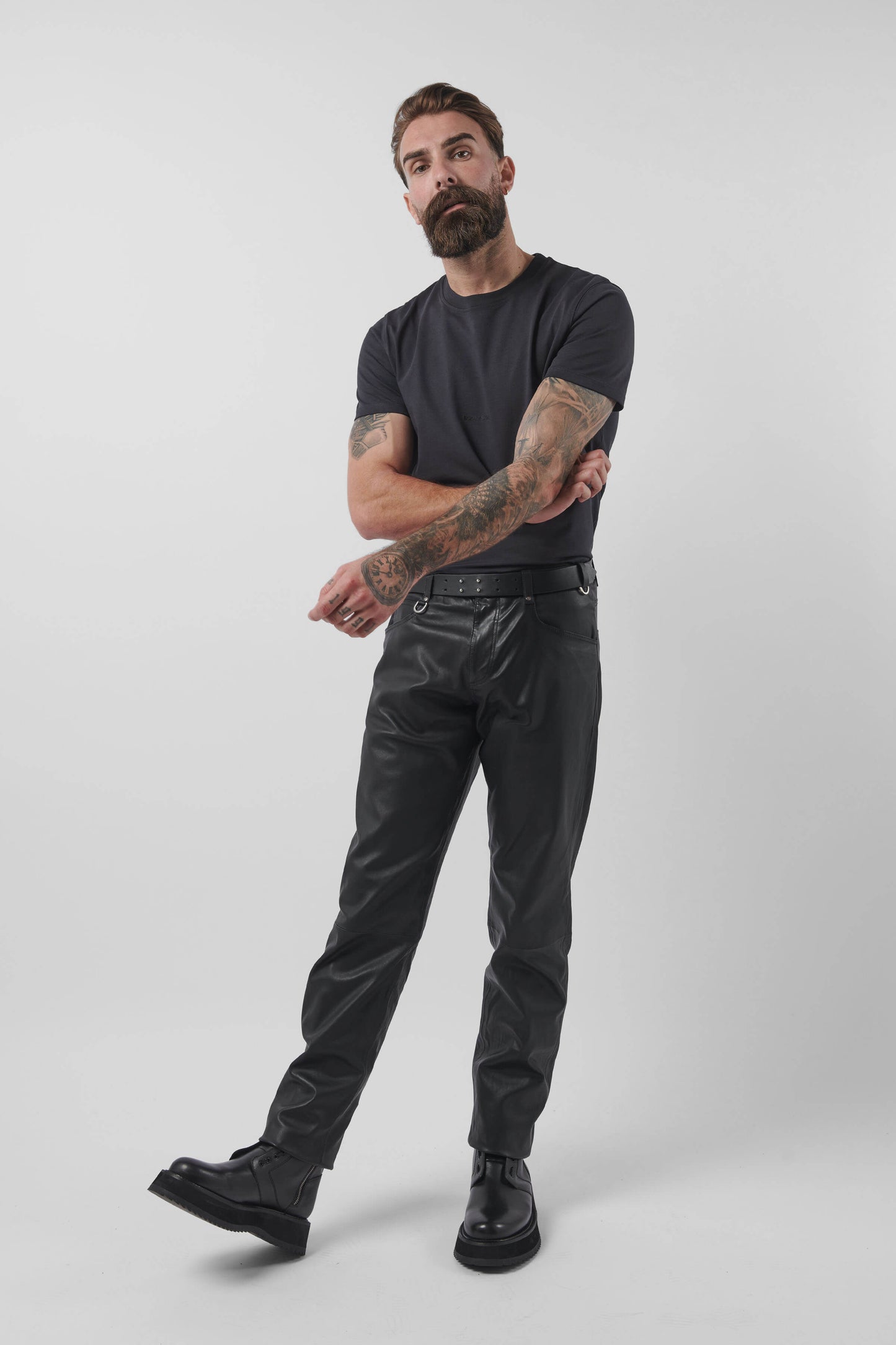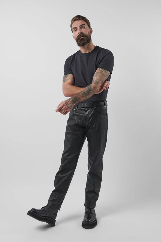 The Straight Leg Stretch Leather Trouser is constructed from sleek Lambs Leather bonded with stretch technology to create a durable fit and maximise comfort. The straight leg, 5 pocket design echoes classic denim detailing, with x2 front and back pockets, in addition to a coin pocket, each secured with domed silver rivets. The brushed silver D-ring and O-ring on the waistband allow for integration of accessory attachments.