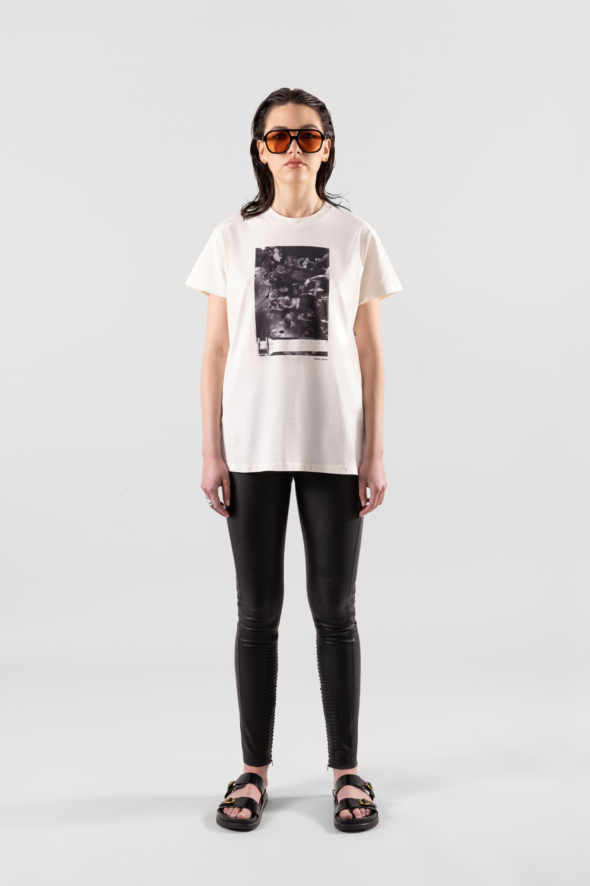 As a celebration of love, the ‘88 collection is the BODA SKINS x Peter J Walsh capsule - inspired by photographs taken from Walsh himself. With the pictures capturing iconic moments in Manchester’s notorious nightclub, The Haçienda, the dance floor was bathed in pink lighting during the Acid House summer of love in 1988. Bright neon lights and technicolour style reunited British ravers during this time, and this look has been encapsulated in the ‘88 Ravers Tee - Dirty Ecru. Crafted from 100% organic cotton, the silhouette is a relaxed fit with ribbed cuffs and neckline. A PU leather label can be spotted at the side seam, while the Peter J Walsh photography has been used intricately to merge the history of Mancunian nightlife and the can’t-stop-won’t-stop attitude of BODA SKINS.