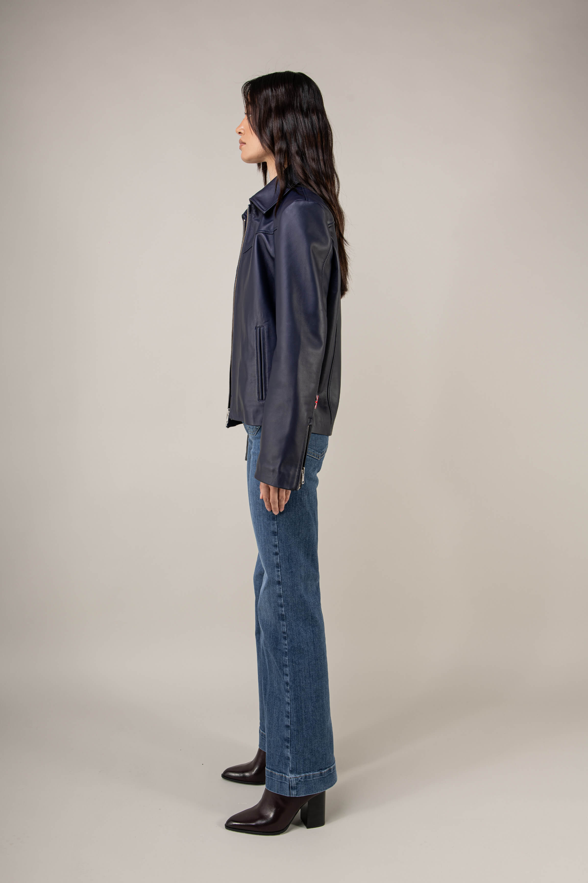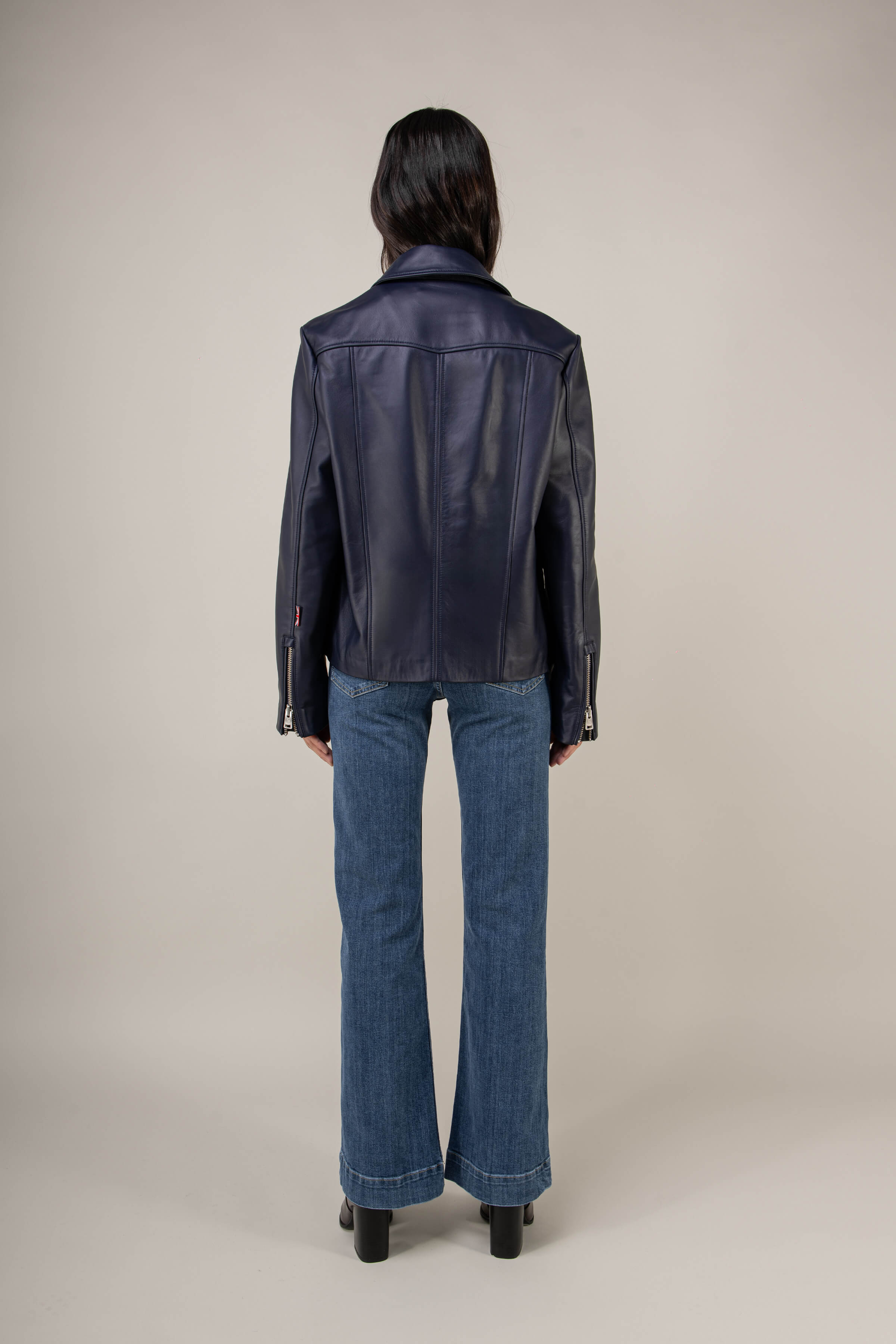 Cut to flatter the natural length of the body, this navy leather jacket enhances the silhouette while allowing unrestricted movement. Whether layered over a crisp white shirt or paired with denim and boots, it transitions effortlessly from day to evening.