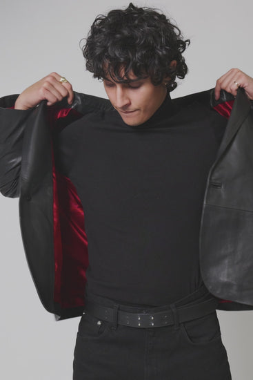 Inside, the premium crimson viscose lining adds a bold yet elegant contrast, ensuring smooth layering and all-day wearability. Designed to transition effortlessly from day to night, this tall black leather blazer elevates any outfit, from business-casual looks with a button-down shirt to more formal ensembles with tailored trousers and boots.