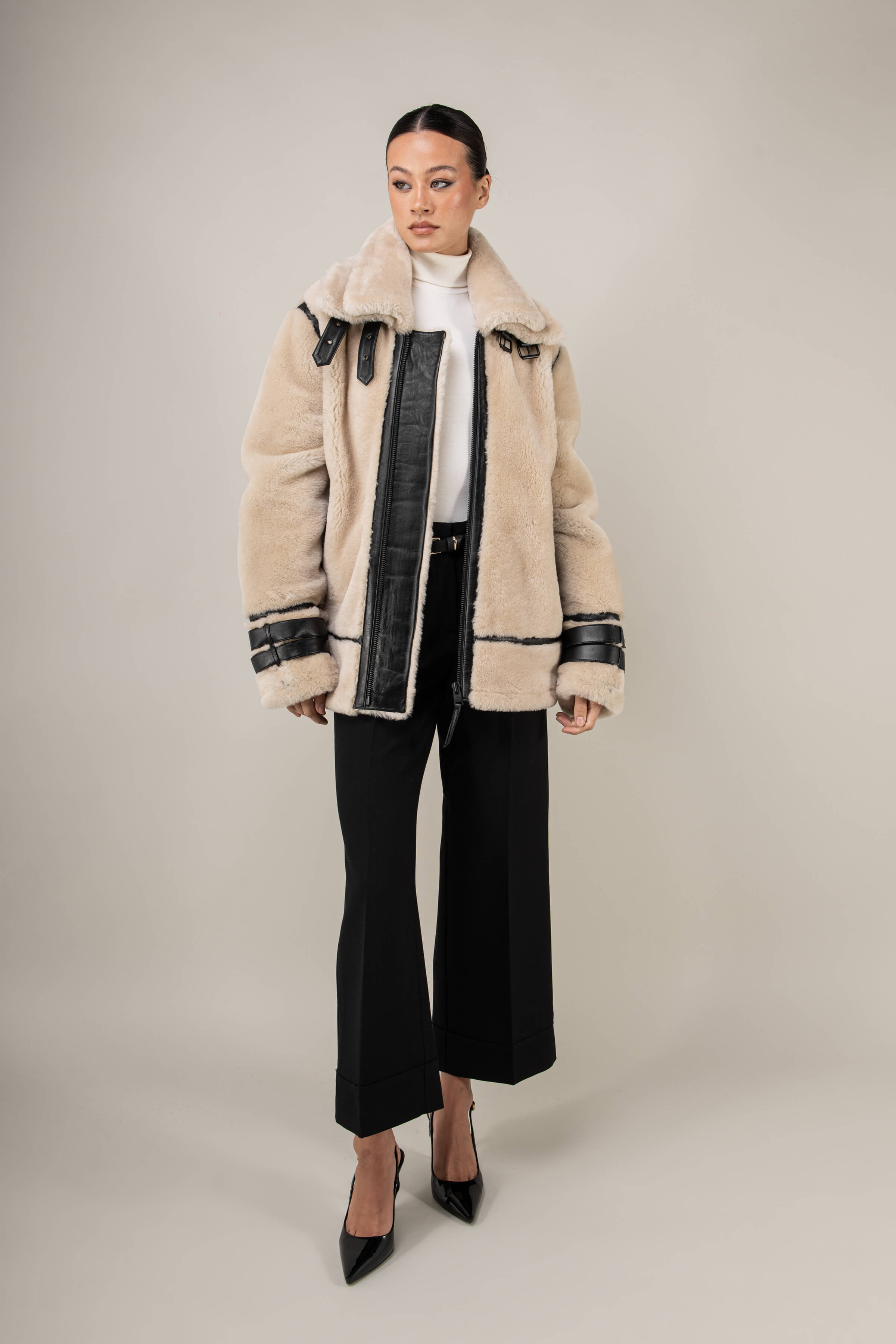 - Doubled removeable shearling collar with undercollar leather buckles.