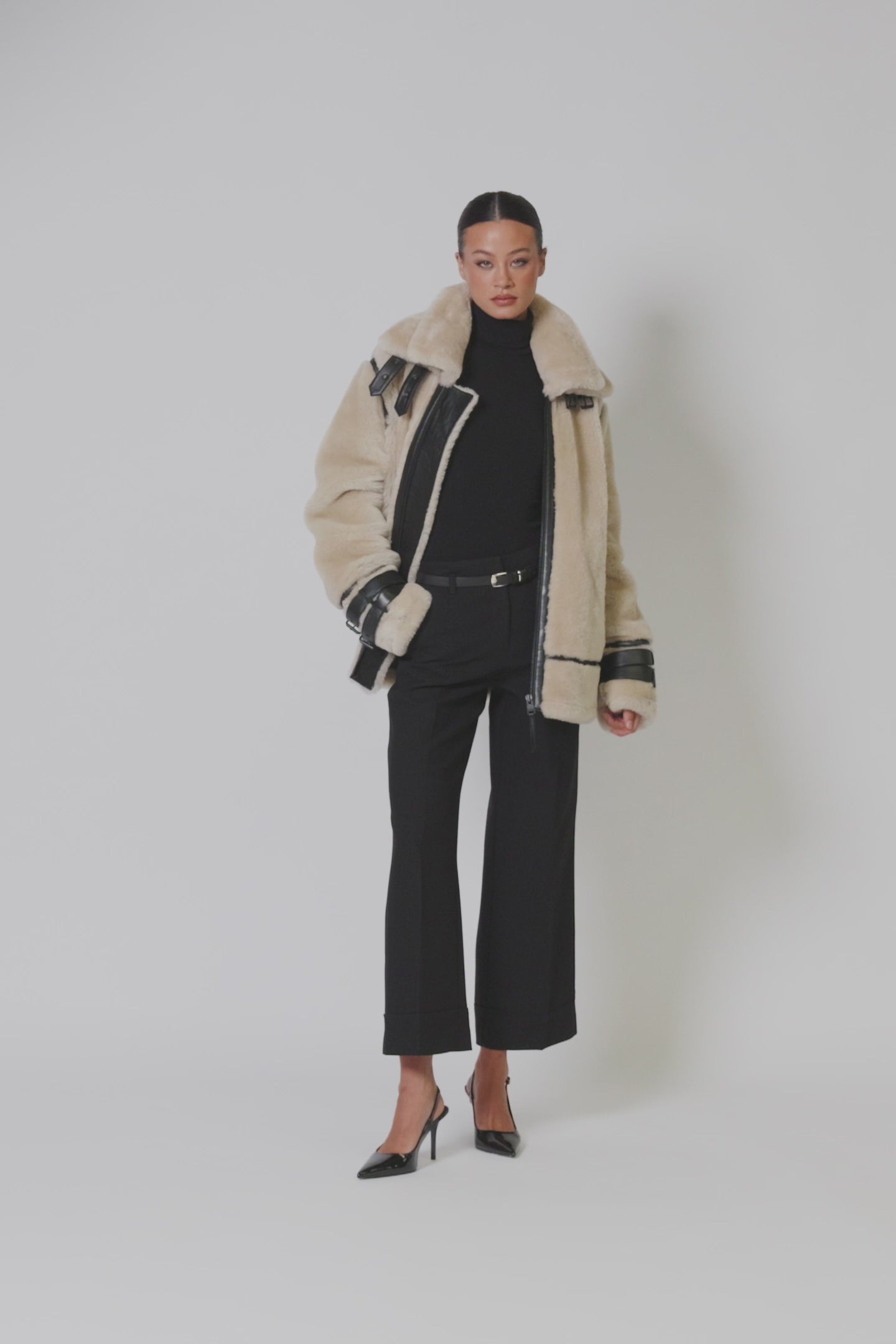 Handcrafted from exclusive, premium shearling, the jacket feels velvety smooth to the touch while offering superior warmth and durability. The body of the jacket is cut from ironed wool shearling, carefully paired with nappa leather contrast details that highlight the silhouette and add a refined edge. Adjustable buckles at the wrist and waist allow for both styling versatility and a personalised fit, while the removable double collar provides layered dimension, wear it structured for colder days or streamline it for a sleeker look.