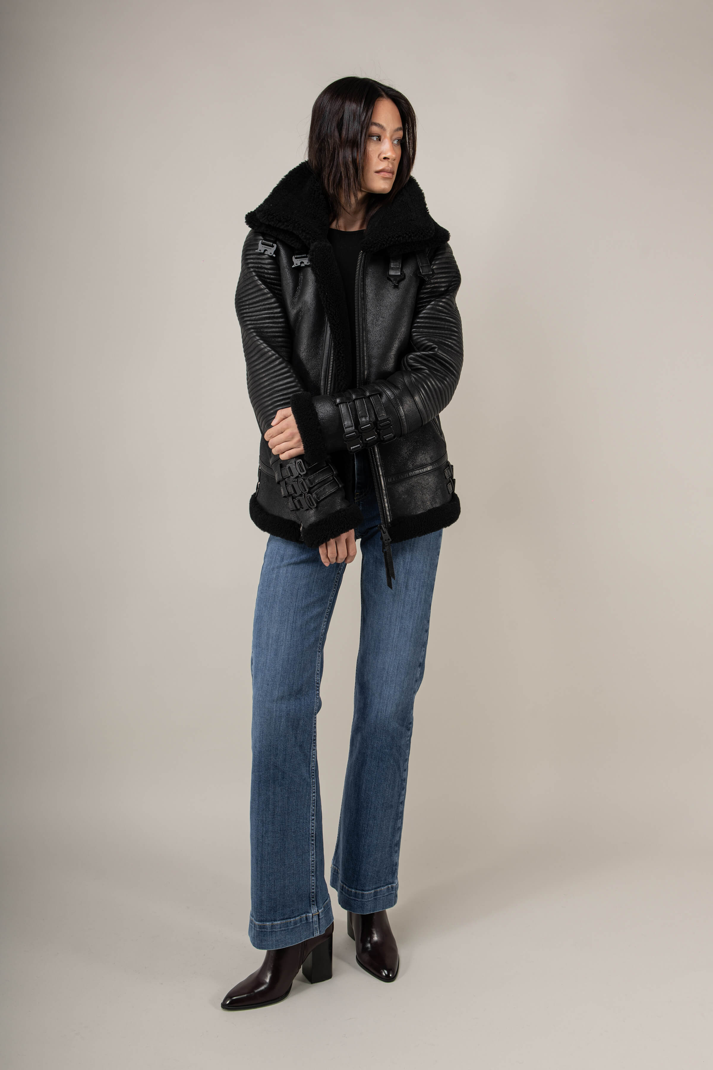 Crafted from the most supple A-grade shearling, the jacket delivers exceptional softness, warmth, and durability. The deep shearling interior provides natural insulation and all-day comfort, while the premium leather exterior is designed to hold its shape and develop character with time. Finished with upgraded BODA SKINS hardware and smooth matte military buckles at the collar, sleeves, and waist, it maintains the warrior-like strength of the original with a sleek, flattering touch.