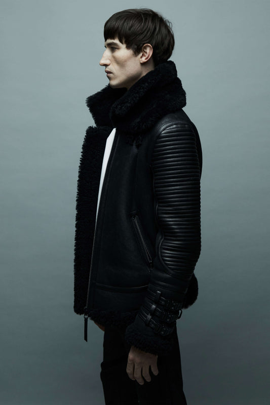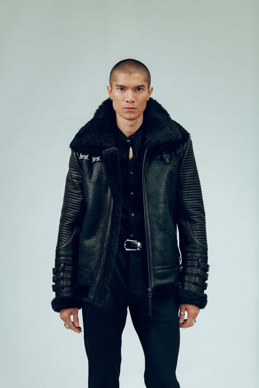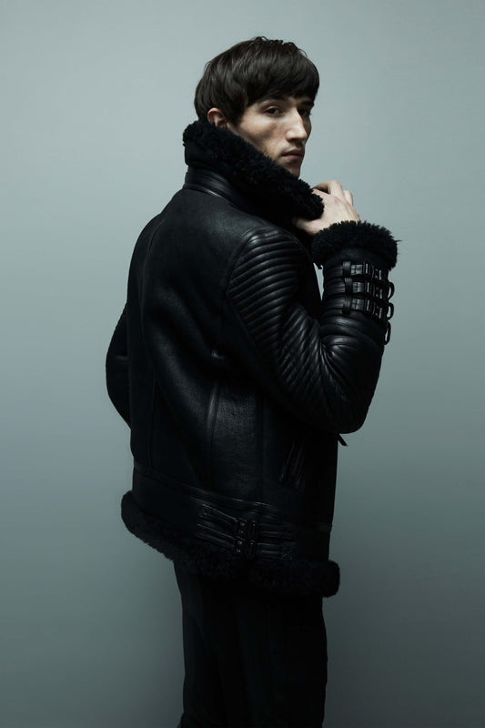 Warrior 3.0 – Luxury Black Shearling Jacket with Military Buckle Detailing