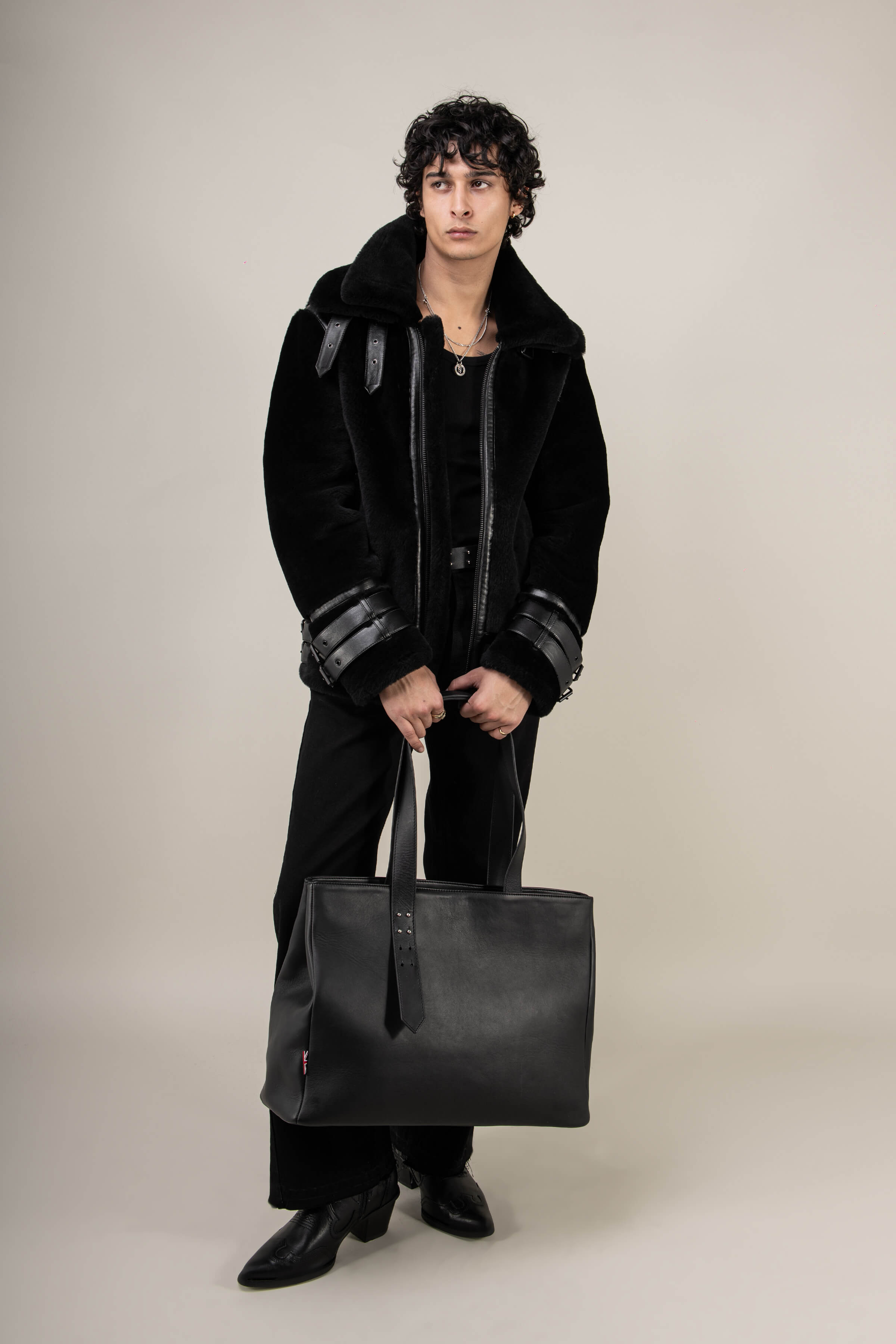 Handcrafted from our exclusive BODA shearling, its velvety exterior and soft leather interior deliver unmatched insulation without sacrificing sleekness. The richness of the Noir shade amplifies the jacket’s oversized silhouette, while smooth Nappa leather detailing provides a sharp contrast in both texture and tone. Rollercoaster buckles at the waist and wrists underscore its utility, while a removable double collar allows for versatile styling, extra warmth when needed, or a clean, pared-back profile for everyday wear.
