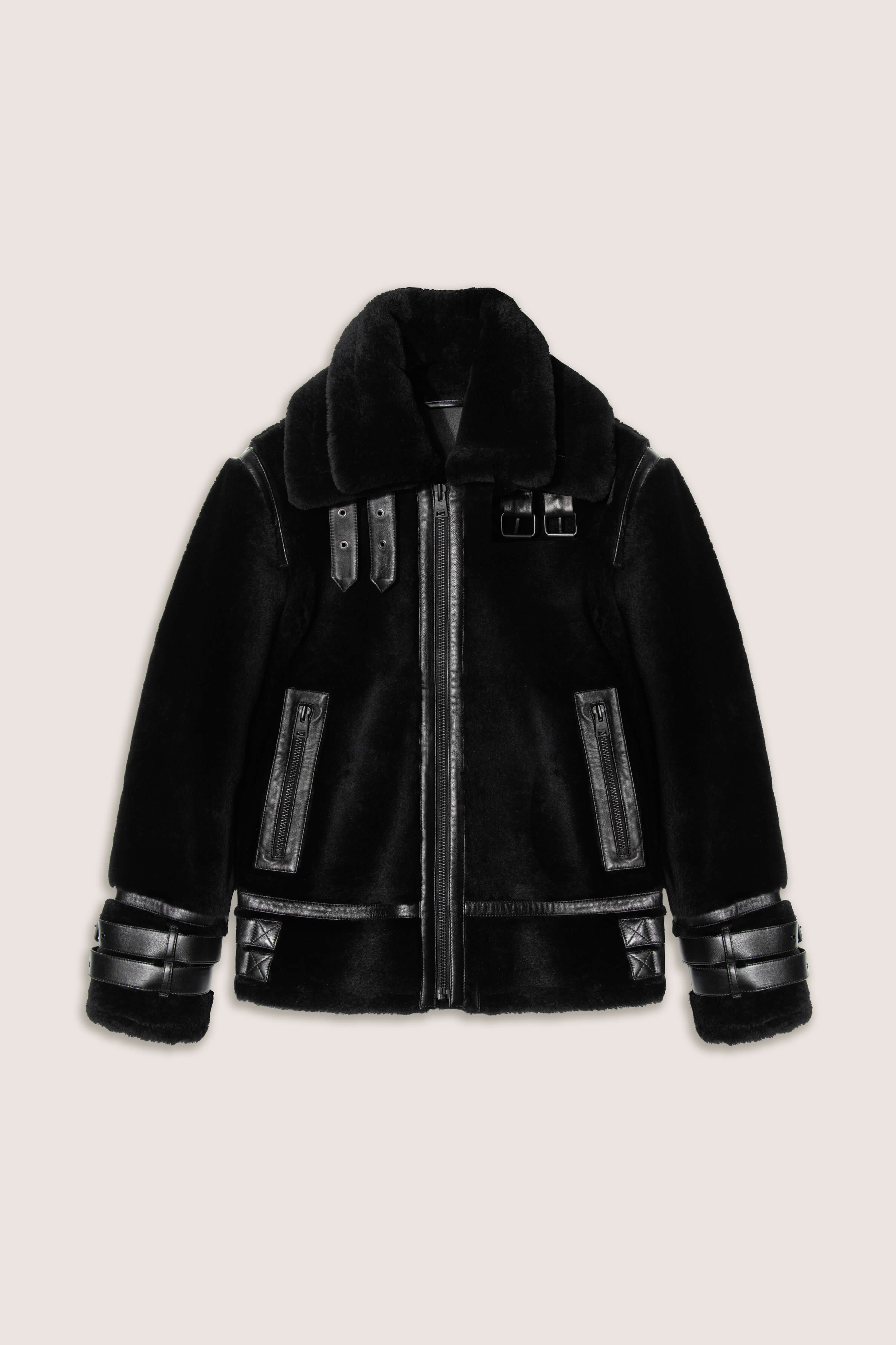 - Doubled removeable shearling collar with undercollar leather buckles.